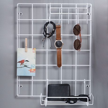 Por otro lado, tenemos otros tipos de percheros metálicos, como cuadrículas organizadoras que son una opción increíblemente versátil para optimizar espacios. Puedes personalizarlas con canastillas para guardar objetos pequeños o colgar accesorios como gorras, bufandas o relojes. Estas permiten crear un sistema de organización dinámico que se adapta a cualquier lugar, desde la sala hasta el estudio.