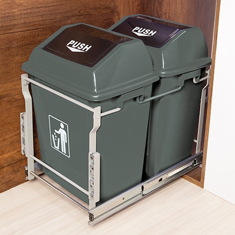 Descripción técnica Basurera con tapa premium módulo: 40 cm, Mínimo frente Libre: 36 cm Incluye: Estructura metálica, rieles y tornillos, 2 basureras plásticas.