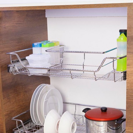 La canasta cromada bajo pozuelo premium de Rejiplas para módulo de 90 cm, es perfecta para organizar utensilios de la cocina, este producto te garantiza aprovechar y optimizar el espacio libre del bajo pozuelo. Al ser un producto ventilado no retiene olores y es fácil de utilizar por su sistema de rieles de extensión.