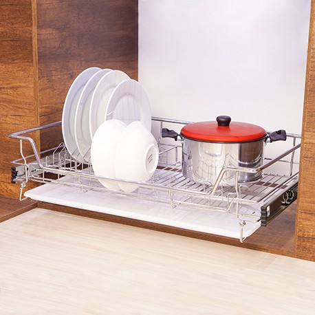 La canasta platero mueble bajo cromada de la línea premium Rejiplas se ajusta a módulo de 80 cm, puedes organizar la loza de una forma organizada. Incluye bandeja escurridora, por lo tanto no tienes que secar los platos, puedes ahorrar más tiempo para ti. Al ser ventilado no retiene olores, es un producto fácil de instalar y fácil de utilizar gracias a su sistema de rieles de extensión.