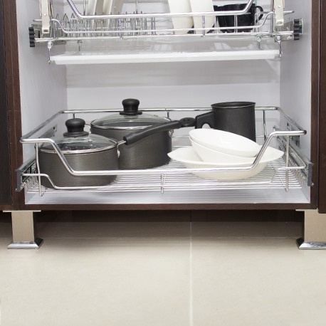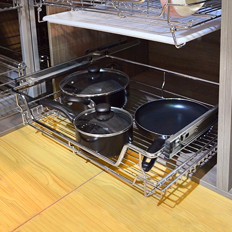 La canasta cromada mueble bajo premium de Rejiplas, se ajusta a un módulo de 80 cm y sirve para ordenar diferentes utensilios de la cocina como ollas, bandejas entre otros organizadores. Esta canasta se instala en el mueble bajo de tu cocina permitiendo optimizar el espacio. Al ser un producto ventilado no retiene olores, es un producto fácil de utilizar por su sistema de rieles de extensión.