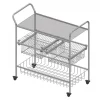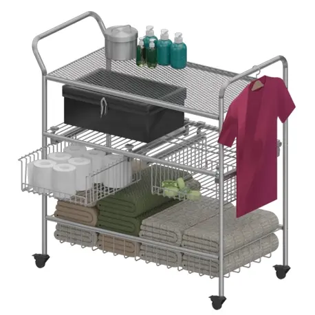 Es un carrito desarmable multiusos para la organización de los hoteles, cuenta con 2 canastas deslizantes, 1 canasta fija y 1 entrepaño en mallado, los parales son ideales para su transporte, además se pueden utilizar de colgadero.