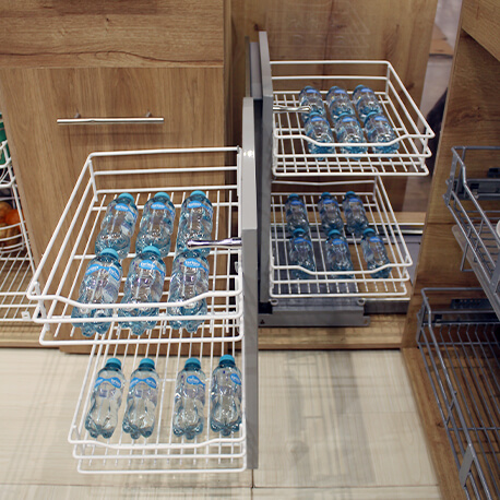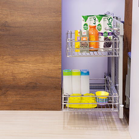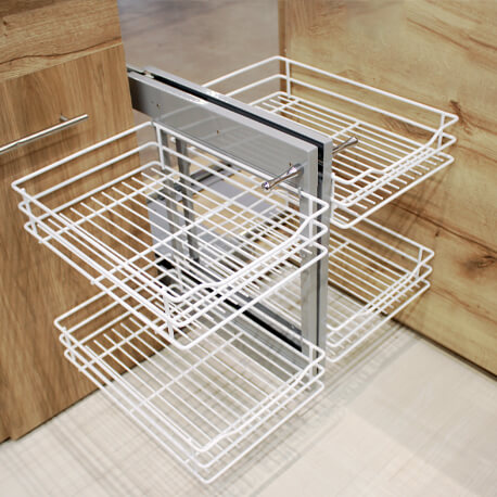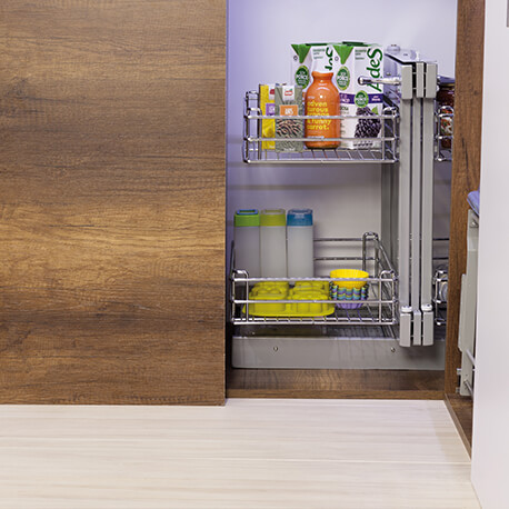 La Esquina Mágica Genérica de Rejiplas, posee un mecanismo que con solo deslizar hacia afuera cada una de las canastas, te permite acceder con facilidad a todo lo almacenado en ella. Con este herraje podrás darle uso a las esquinas que tienden a ser espacios inutilizados y desperdiciados en la cocina.