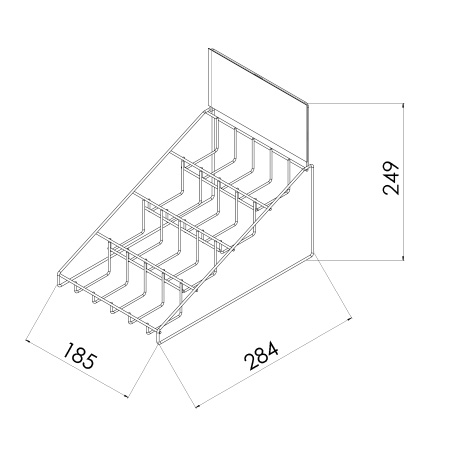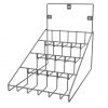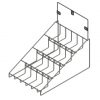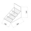 Exhibidor de mesa a modo de escalera con 4 peldaños que distribuyen los productos ahorrando espacio. Incluye arandelas superiores para instalar publicidad