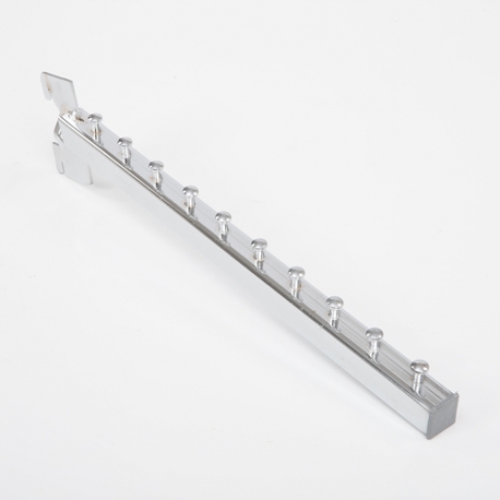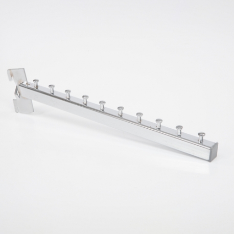 Ganchera industrial con sistema de fijación tipo cremallera. Su diseño con perfil cuadrado e inclinado, te ayudará a exhibir tus productos de manera práctica y visible en cada uno de sus 10 pines. Se fija fácilmente en las cremalleras de 60 cm cód. 1541, 100 cm cód. 1543, 150 cm cód. 1546 o de 180 cm cód. 1548.