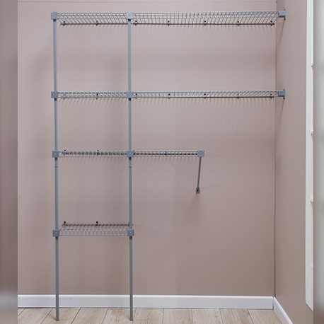 El Grand closet en rejilla de Rejiplas, es un kit en caja muy completo con el que podrás desarrollar proyectos de organización como clóset, cuarto útil, despensa, stock de almacenamiento en la oficina, etc.