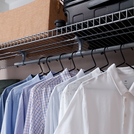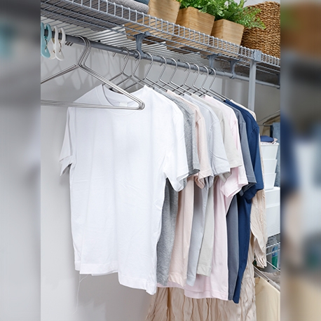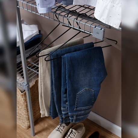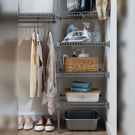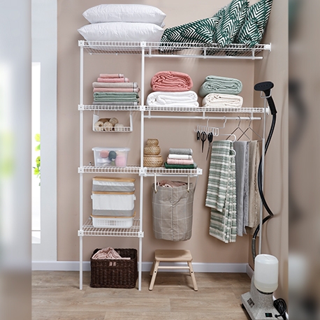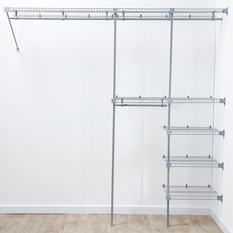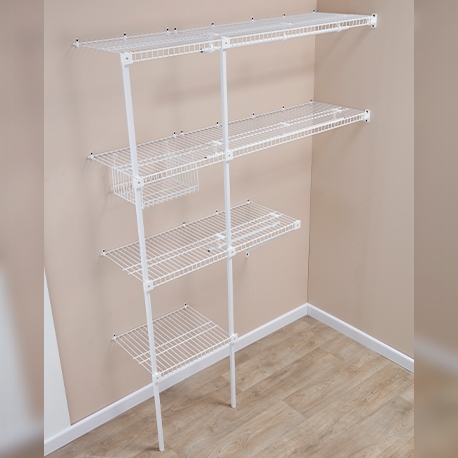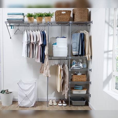 Su acabado plastificado lo hace resistente a la humedad, no retiene malos olores y es ventilado. Se ajusta a espacios de 1 a 2.5 m. Incluye 4.5 m de entrepaños de 40 cm de profundidad y 2.5 m de tubo colgadero.