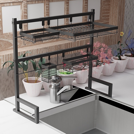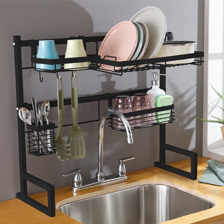 El Soporte auxiliar lavaplatos de Rejiplas tiene un diseño moderno y dinámico que será tu mejor aliado al momento de ordenar tu vajilla, cubiertos, especias o lo que tu espacio requiera ordenar. Este contiene los siguientes accesorios colgantes: 1 Escurridor de platos · 1 Cubiertero · 1 Canasta con ganchos · 1 Canastilla multiusos, todo para que organices tus elementos como más lo necesites.