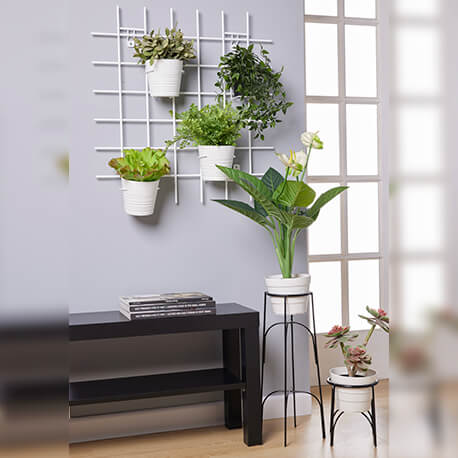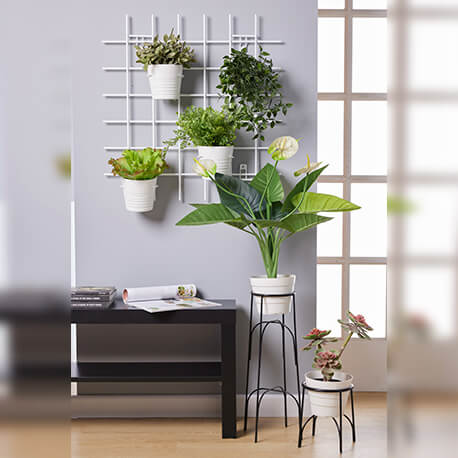 | Componentes | 1 Soporte piso arco alto, 1 matera en plástico blanca |
