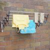 Descripción técnica Tendedero de pared fabricado en aluminio de 4 tubos de 80 cm. Al expandirlo hacia el frente mide 60 cm de profundidad aprox. Caben de 2 a 3 prendas extendidas en cada tubo.