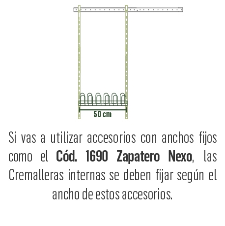 | Descripción técnica | Para su instalación son necesarias las cremalleras cód. 1543, 1546 o 1548, estas deben estar separadas entre si por 50 cm. |
